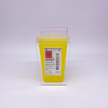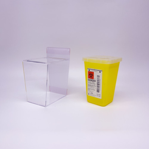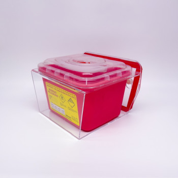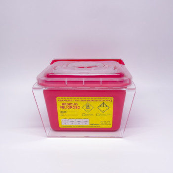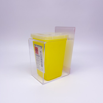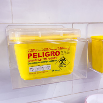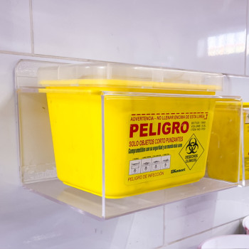 Diseñado especialmente para entornos médicos, este soporte acrílico tipo marco permite fijar de forma segura las cajas de descarte de material cortopunzante directamente a la pared. Su diseño abierto facilita el reemplazo rápido de las cajas y mantiene el área limpia y organizada. Disponible en diferentes tamaños según el litraje de cada caja.